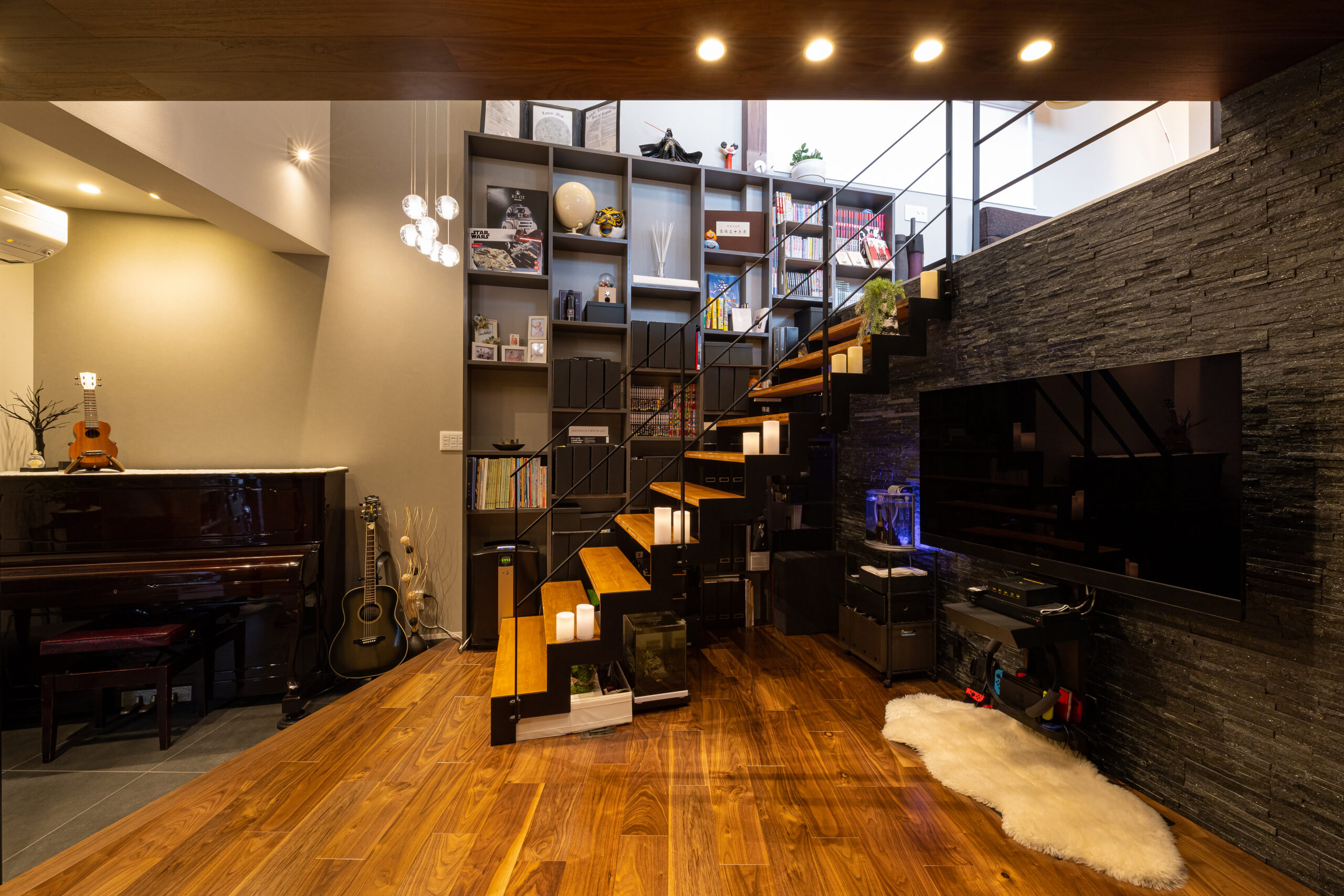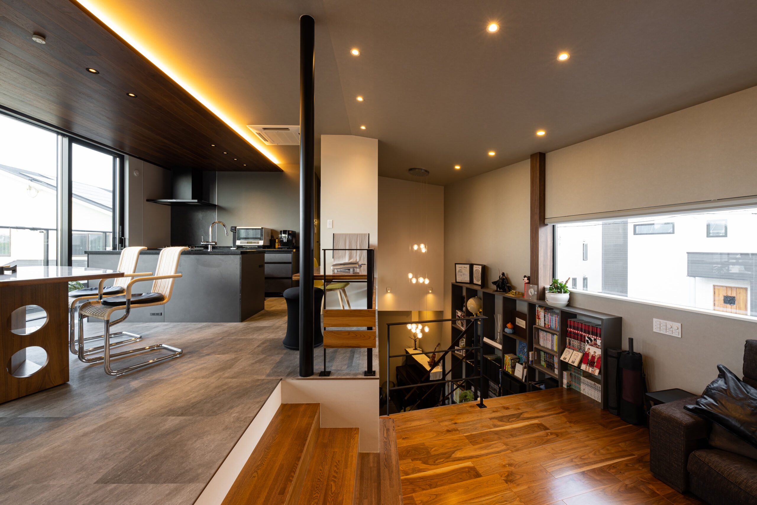施工事例 階段本棚のある住まい 階段本棚のある住まい 間取り木造2階建て 家族構成4人家族 建物面積1F:65.85 ㎡ 2F:62.12 ㎡ 建築年月日R3年3月 建築地兵庫県神戸市 スキップフロアを採用することにより、空間を緩やかに繋ぎ、さりげなく家族の様子を見守ることができる住まいを実現。 毎日通る階段横に本棚を設けることで、まるで図書館のようなスペースに。 階段を椅子代わりにして読書を楽しむことができ、自然と本に触れ合う生活に。 自由に過ごし方を変えられるフレキシブルな空間とした。