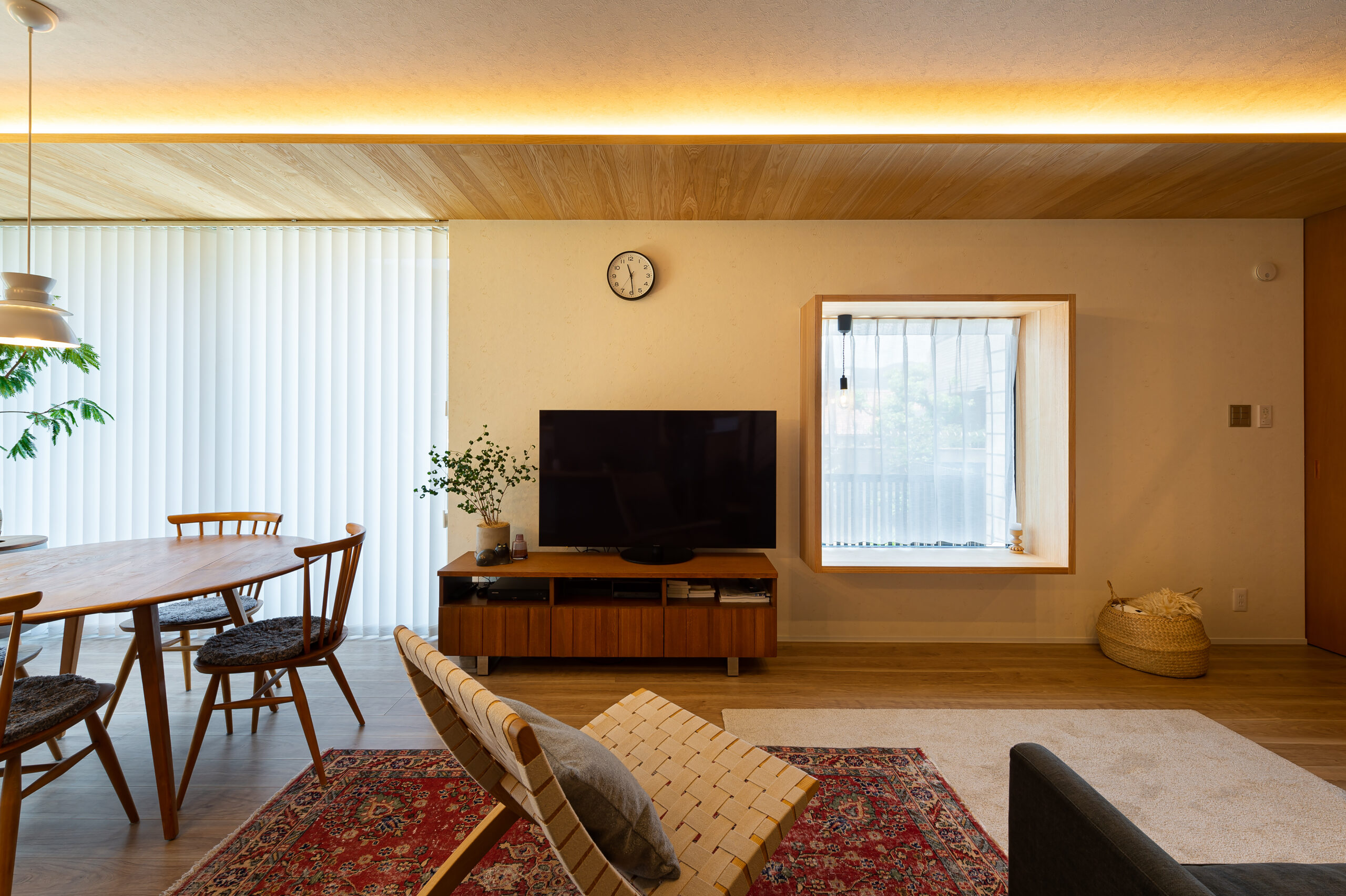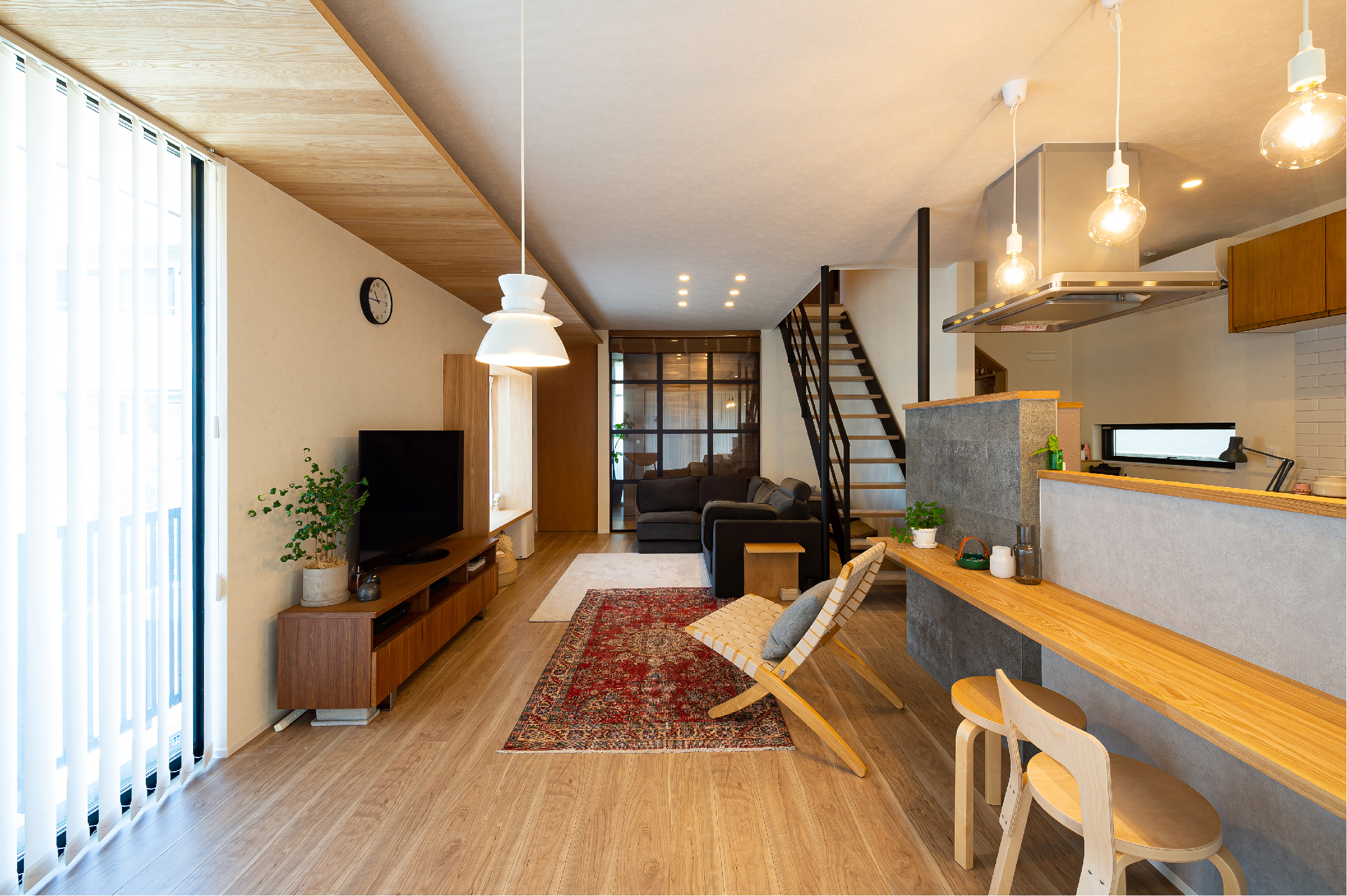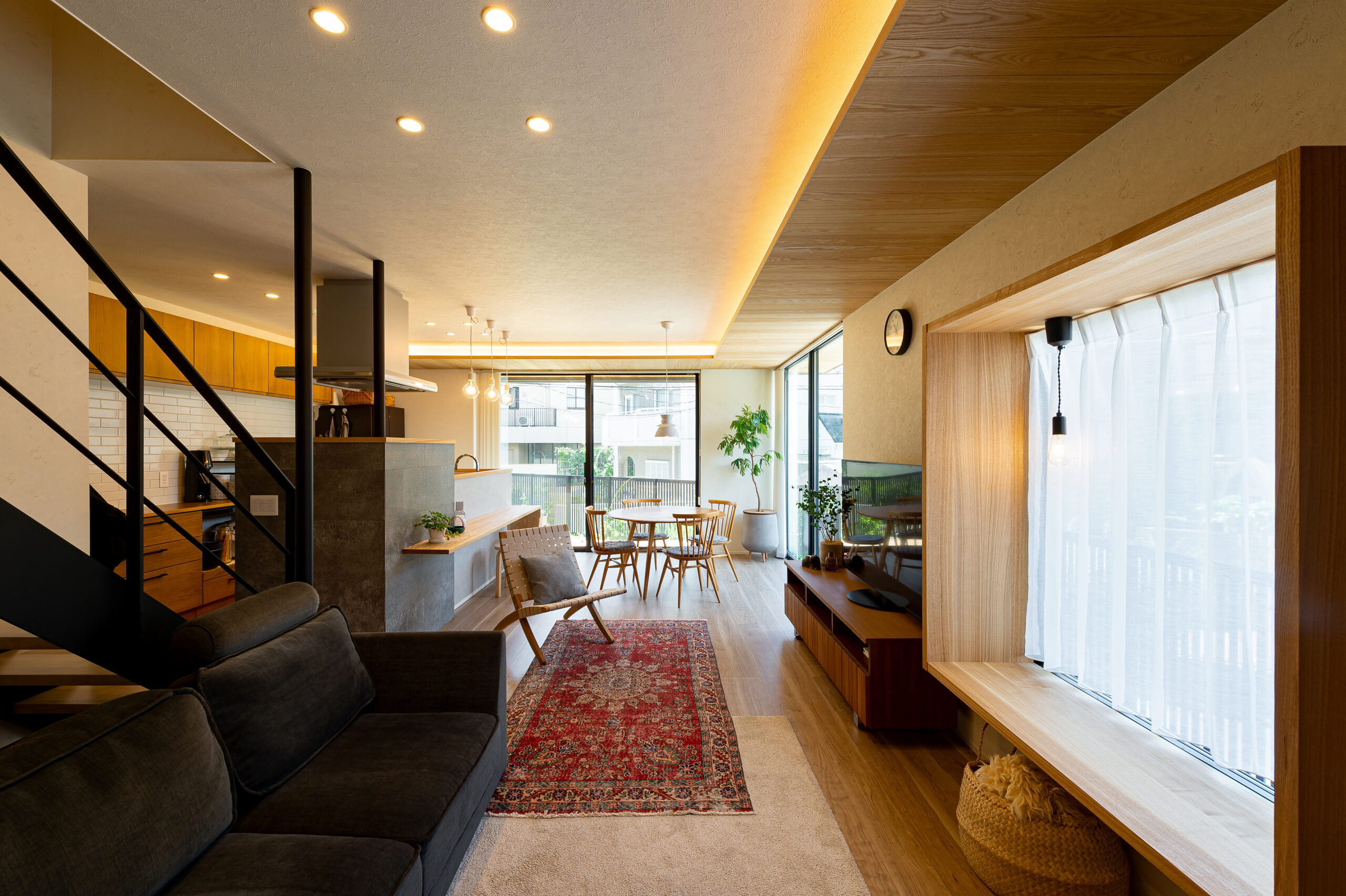 施工事例 愛猫とのあたたかな暮らし 愛猫とのあたたかな暮らし 間取り木造2階建て 家族構成3人家族 建物面積1F:59.20㎡ 2F:59.20㎡ 建築年月日R2年12月 建築地兵庫県西宮市 3匹の猫と心地よく暮らす家。 外からの視線が気にならない開放的なリビングは、 内外がつながった木の天井と、間接照明のやわらかい光が 人や愛猫を優しく包み込む。 木を多く取り入れた空間に、鉄の階段や柱、格子窓の枠を黒で統一することで 全体的に柔らかな空間を、モダンで少し大人な雰囲気に仕上げている。 窓枠の幅を広くした愛猫のひなたぼっこ空間には、1日中優しい光が差し込む。