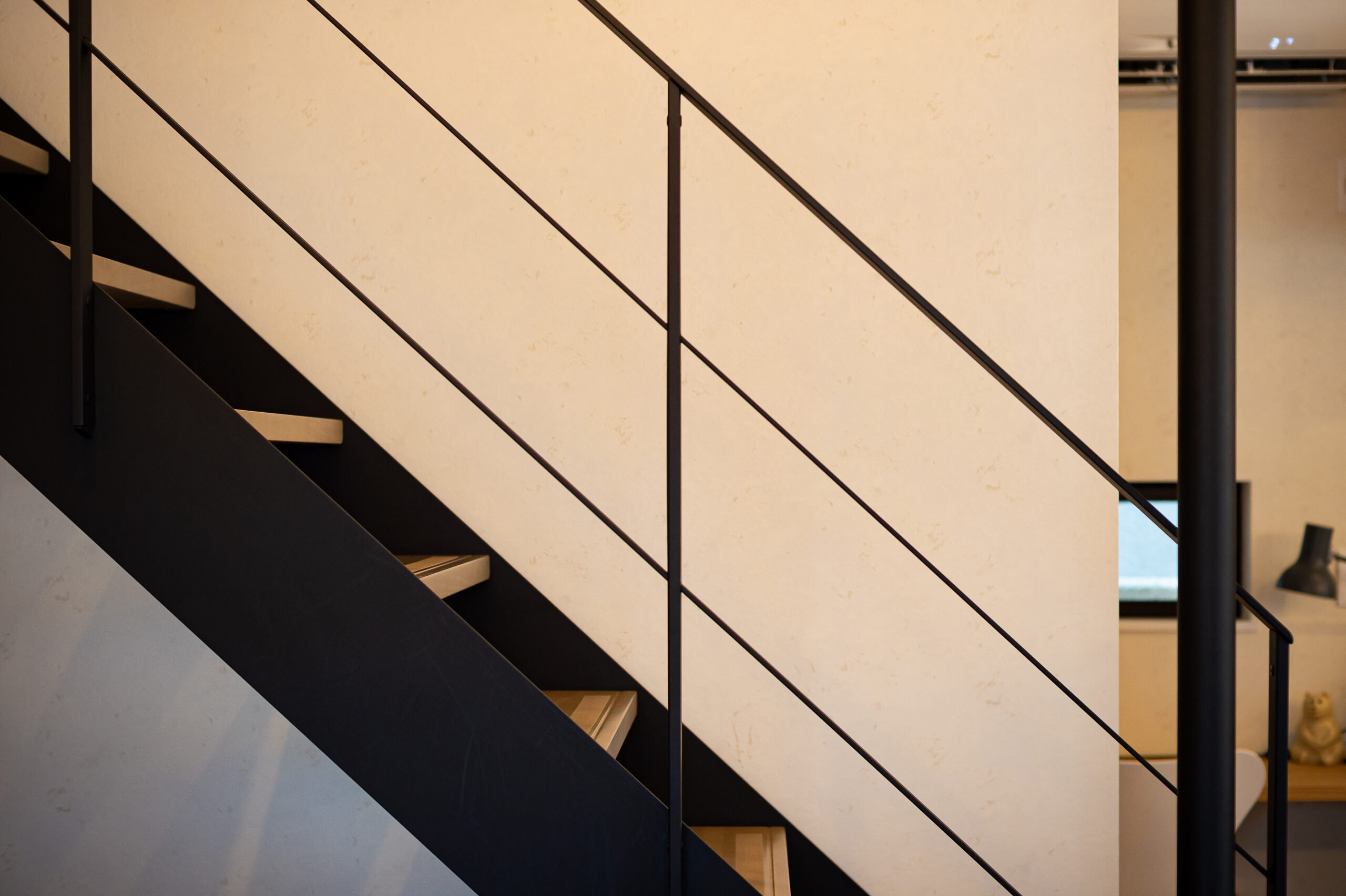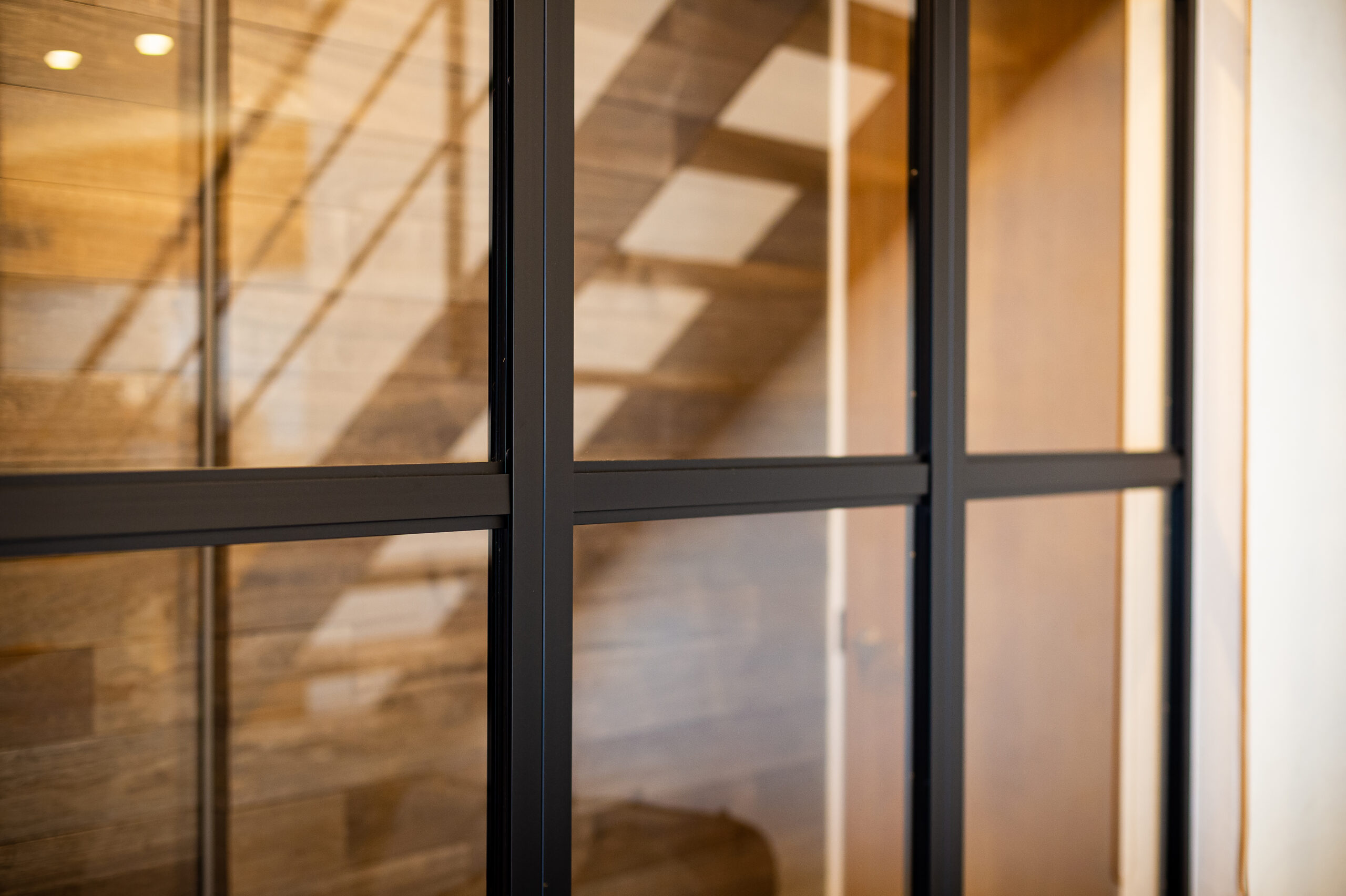 木を多く取り入れた空間に、鉄の階段や柱、格子窓の枠を黒で統一することで
