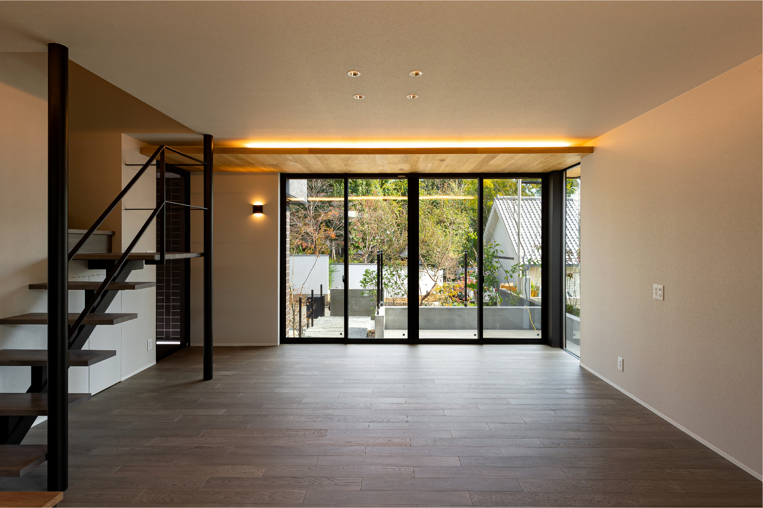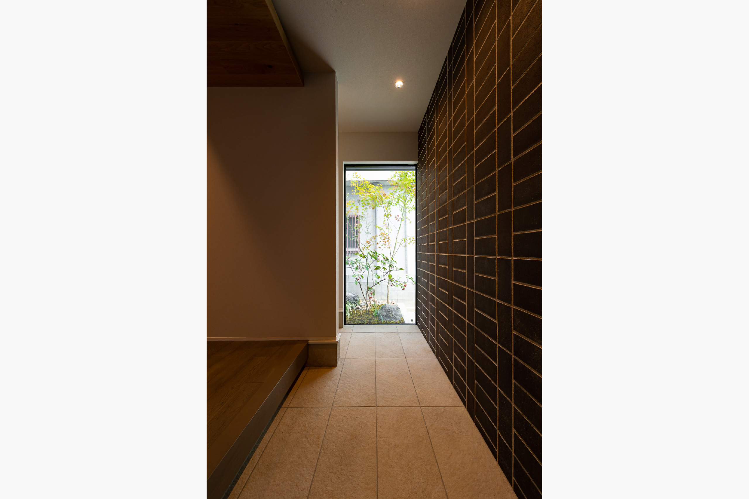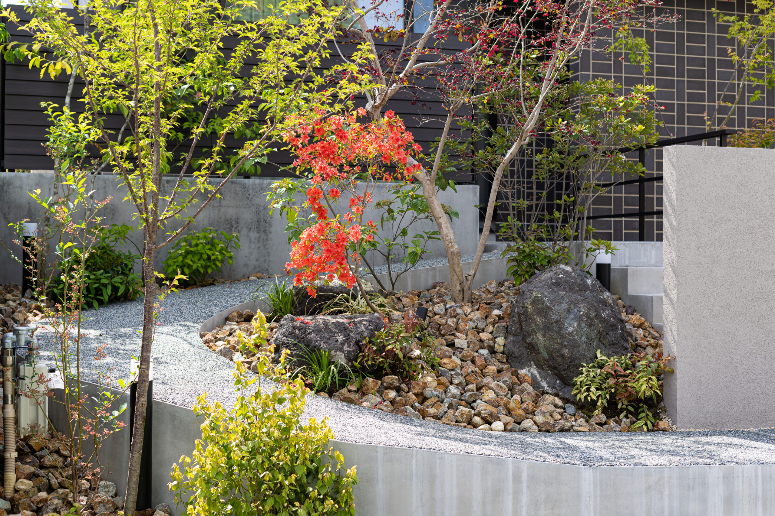 柔らかな曲線を描いた玄関までのアプローチに四季折々の植栽計画がなされ、毎日の外出時に季節の移ろいを感じられる住まい。